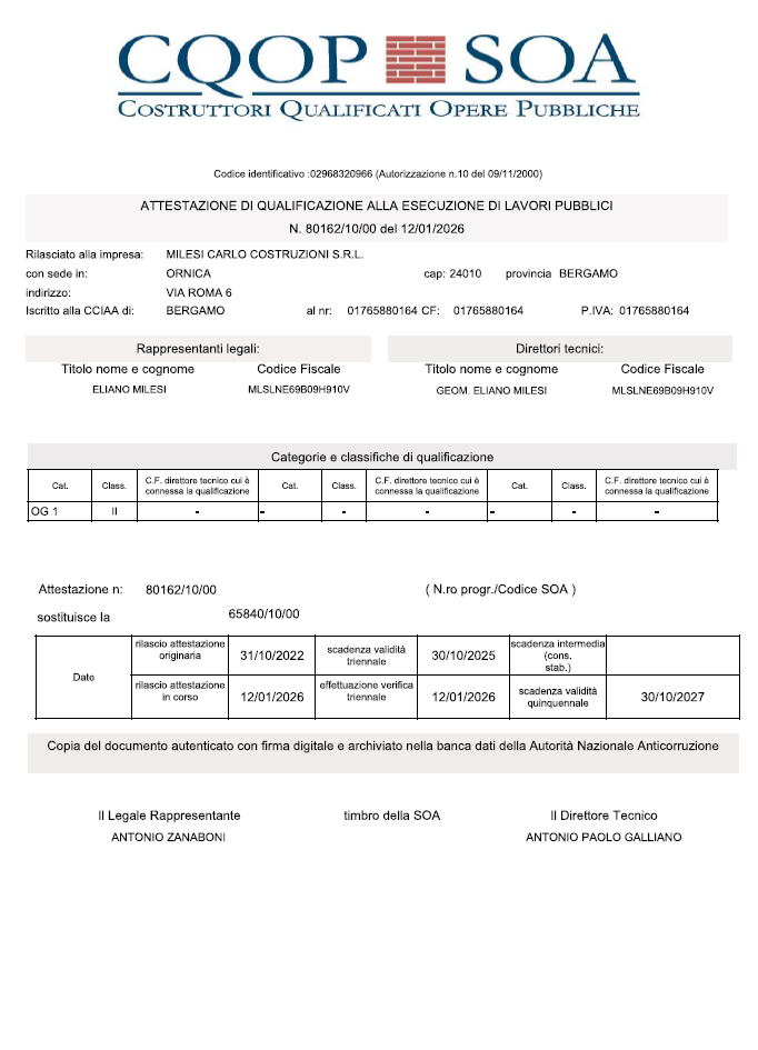 L’impresa è in possesso dell’attestazione SOA per la categoria OG1 (edifici civili e industriali) in classe II, garanzia di qualificazione per l’esecuzione di lavori pubblici.